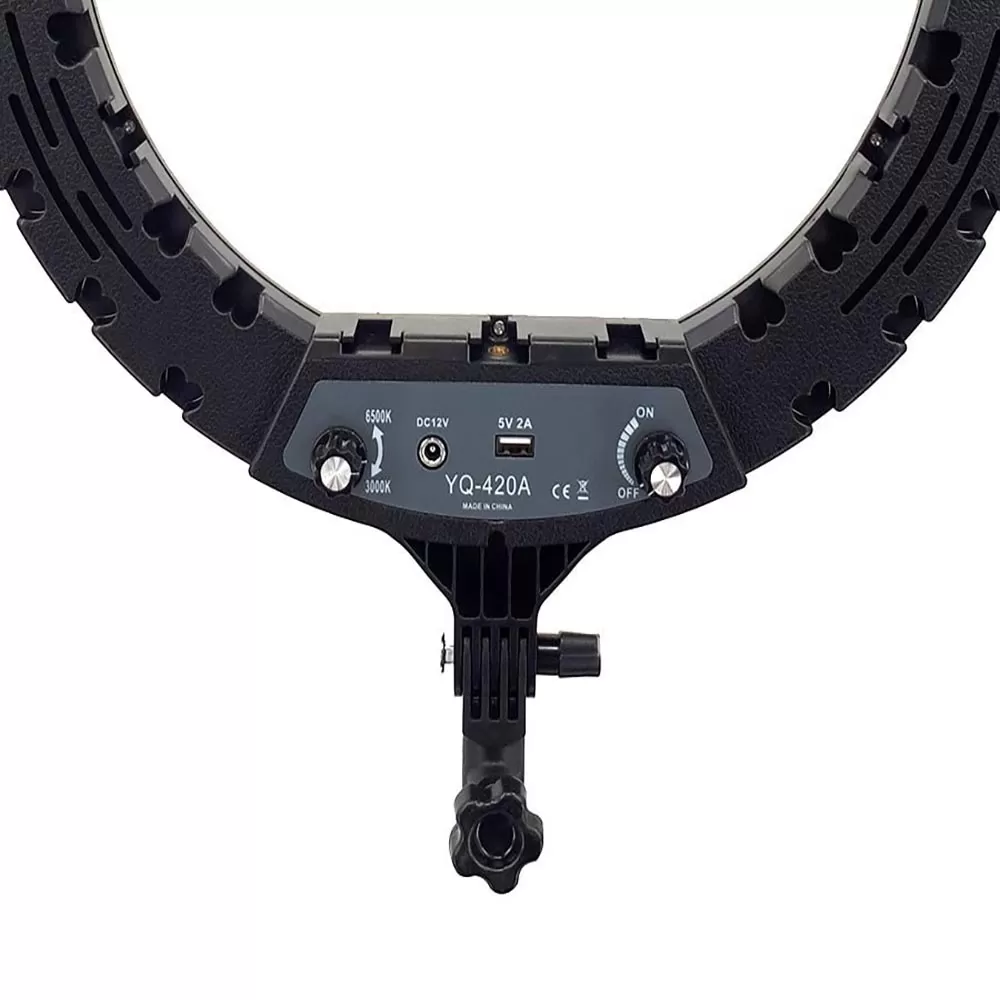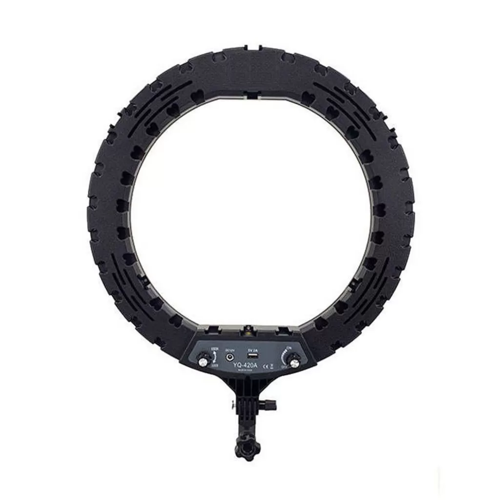 رینگ لایت YQ420A با قطر 40 سانتی متر و با قدرت 40 وات از پرطرفدار ترین رینگ لایت های بلاگری تولید محتوا،آرایشگری( زیبایی و تتو و کاشت ناخن) میباشد . این رینگ لایت  قابل استفاده با آداپتور و برق شهری است. در روی بدنه رینگ لایت یک عدد خروجی USB برای شارژ همزمان تلفن همراه قرار دارد.
